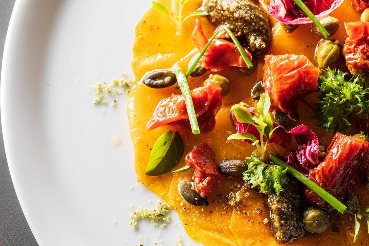 kobasice, šunka, čvarci, svježi sir s bučinim uljem, kukuruzni kruh, gljive, ukiseljeno povrćeZIMSKE ROLICEtanko rezana muškatna buča punjena kremom od patke, julliene povrće, kesten, umak od jogurta i limuna